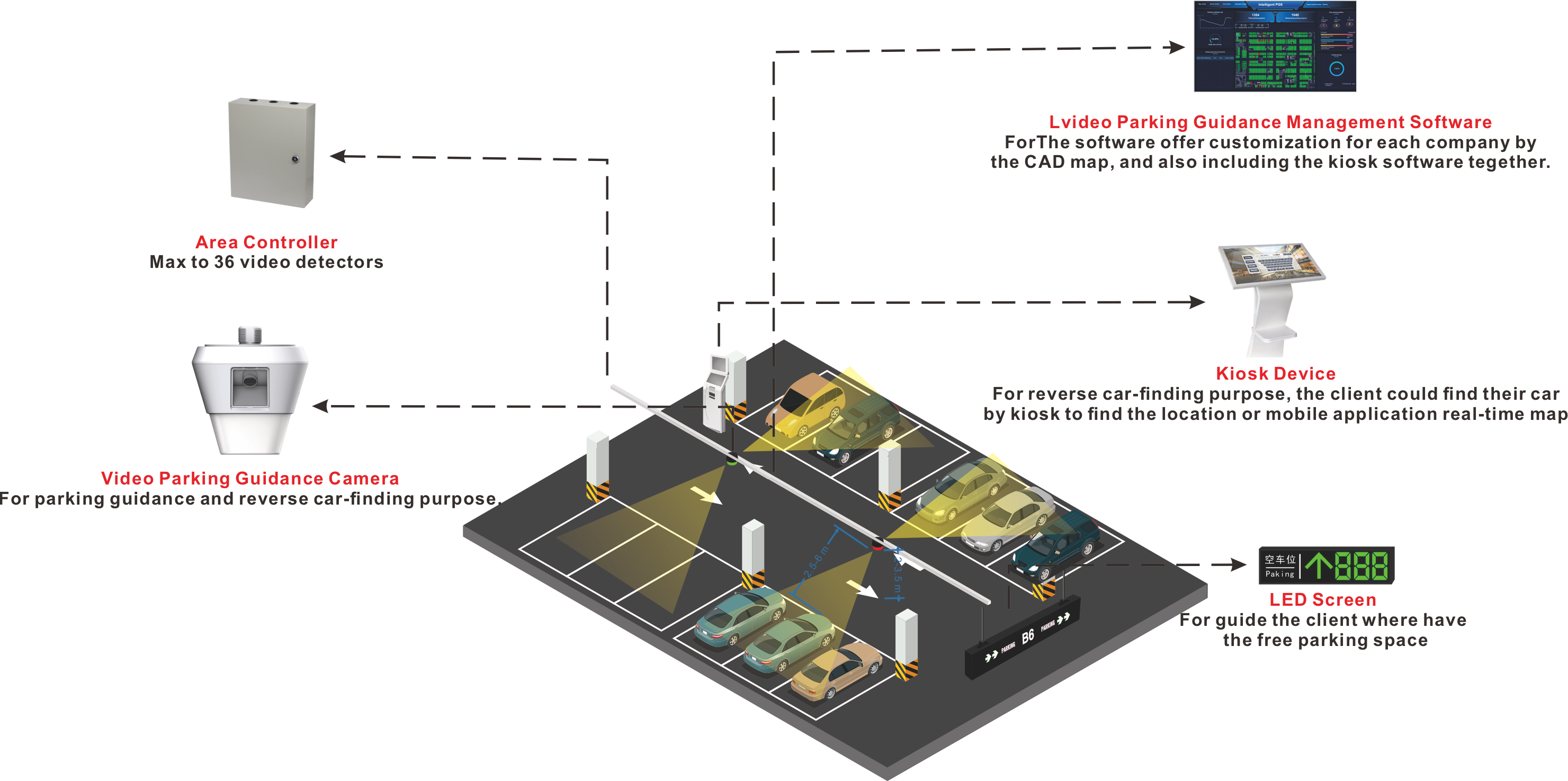 Video-Based Parking Guidance & Car Finding System Transform your parking facility into a smart, driver-friendly environment. Our video guidance system uses intelligent cameras above parking spaces to detect occupancy in real-time, guiding drivers to open spots via color-coded LEDs (Red/Green). Beyond guidance, the system doubles as a security surveillance network and enables a "Find My Car" feature, allowing visitors to locate their vehicles instantly via kiosks.